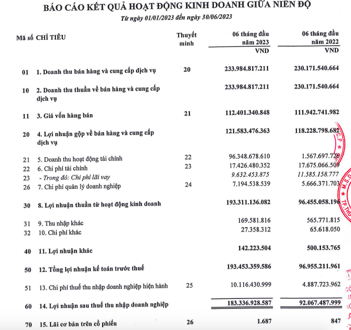 Đáng chú ý, doanh thu hoạt động tài chính gấp 64 lần so với nửa đầu năm ngoái lên mức 96,3 tỷ đồng. Chi phí tài chính đi ngang, chi phí quản lý doanh nghiệp tăng 26,7% lên mức 7,1 tỷ đồng.