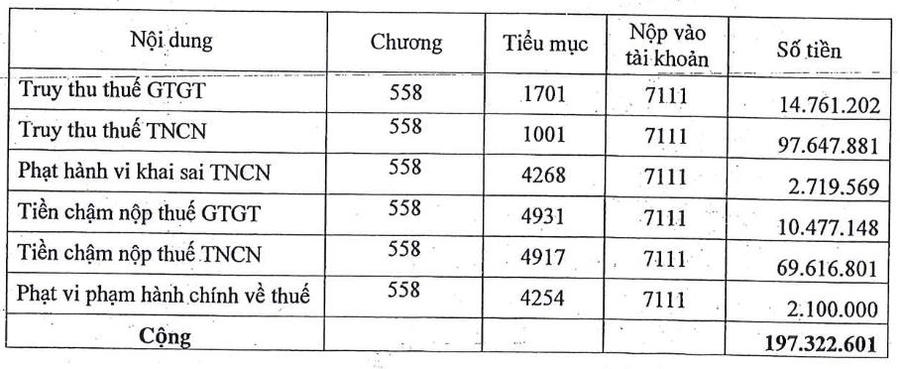 Cụ thể, TDM bị xử phạt hành chính về thuế và do khai sai thuế thu nhập cá nhân gần 5 triệu đồng, bị truy thu hơn 112 triệu đồng và tiền chậm nộp 80 triệu đồng.