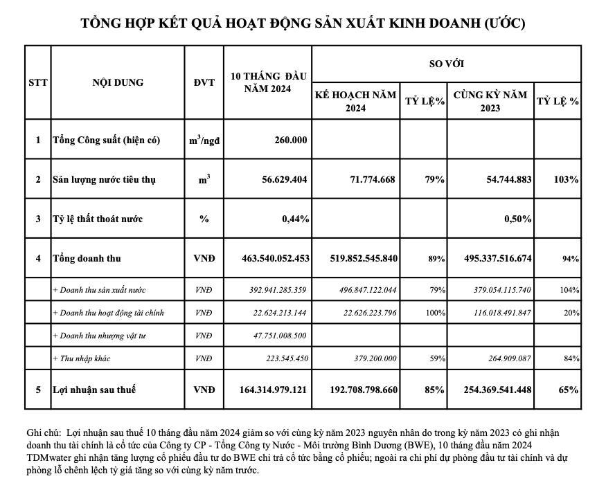Theo TDM Water, lợi nhuận công ty 10 tháng đầu năm 2024 giảm do cùng kỳ năm 2023 ghi nhận doanh thu tài chính từ cổ tức tiền mặt của Công ty cổ phần - Tổng công ty Nước - Môi trường Bình Dương (Biwase, mã ck: BWE). Trong khi 10 tháng đầu năm nay, thay vì trả cổ tức bằng tiền, Biwase trả cổ tức bằng cổ phiếu.
