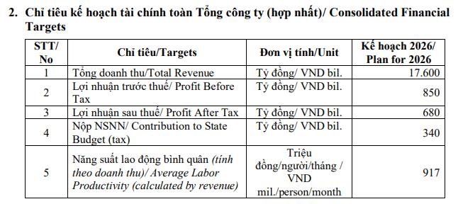 Theo đó, công ty đặt mục tiêu đạt 17.600 tỷ đồng doanh thu, tăng trưởng 10% so với năm 2025. Dự kiến, lợi nhuận trước thuế là 850 tỷ đồng và lợi nhuận sau thuế đạt 680 tỷ đồng.