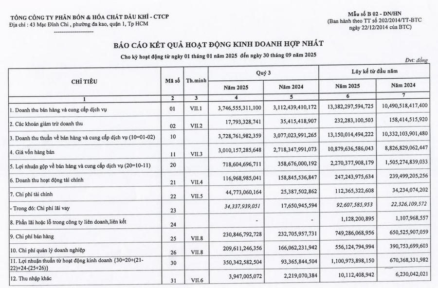 Về bức tranh tài chính, tính chung 9 tháng đầu năm, Đạm Phú Mỹ chứng kiến doanh thu tăng trưởng 27% lên 13.150 tỷ đồng. Lợi nhuận sau thuế lũy kế đạt 863 tỷ đồng, cao gấp rưỡi so với cùng kỳ năm ngoái.
