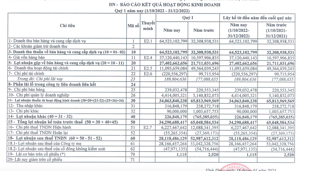 Theo báo cáo tài chính quý I/2023 (niên độ từ 01/10/2022 - 30/09/2023), Công ty đạt gần 65 tỷ đồng doanh thu thuần, gấp 2 lần cùng kỳ năm trước.