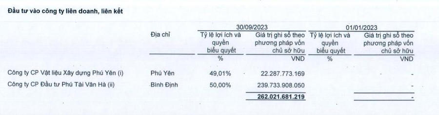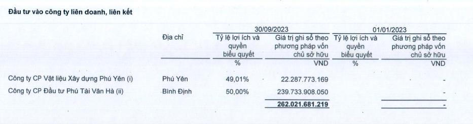 Đáng chú ý, đầu tư tài chính dài hạn tăng gấp 17 lần so với hồi đầu năm, lên mức 262,6 tỷ đồng, chủ yếu là do khoản đầu tư vào công ty liên doanh, liên kết là Công ty cổ phần Vật liệu Xây dựng Phú Yên và Công ty cổ phần Đầu tư Phú Tài Vân Hà.