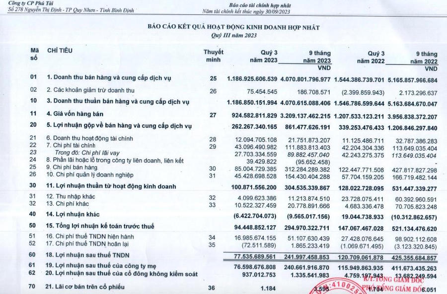 Về kết quả kinh doanh, trong quý III/2023, Công ty Phú Tài ghi nhận doanh thu đạt 1.186,8 tỷ đồng, giảm 23,3% so với cùng kỳ.