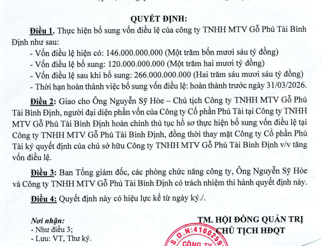 Cụ thể, công ty Phú Tài thông qua việc góp thêm vốn bổ sung 120 tỷ đồng vào Công ty TNHH MTV Gỗ Phú Tài Bình Định, qua đó nâng vốn điều lệ từ 146 tỷ đồng, lên 266 tỷ đồng. Thời hạn hoàn thành việc bổ sung vốn điều lệ này dự kiến trước ngày 31/3/2026.
