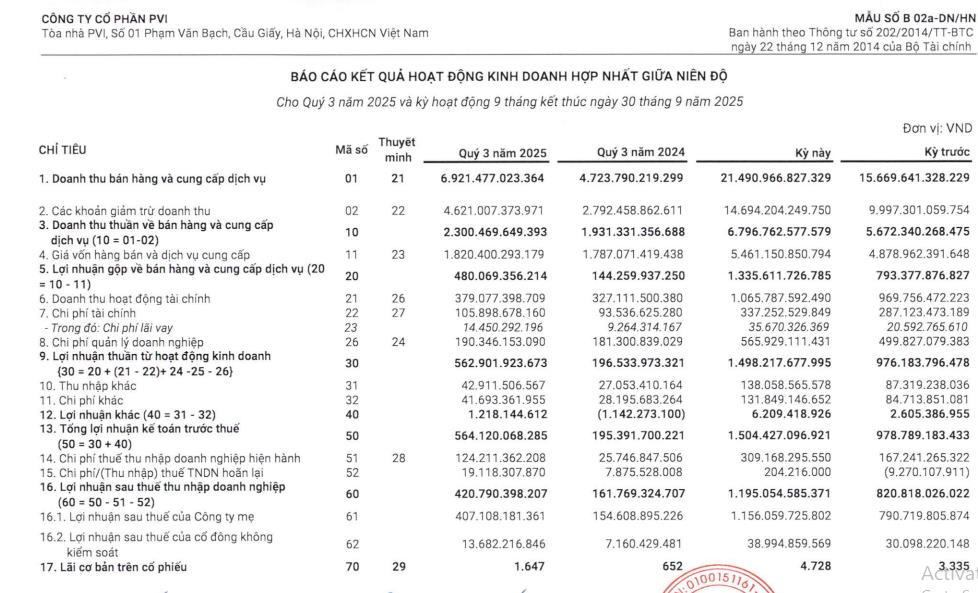 Cụ thể, trong quý III/2025, PVI ghi nhận doanh thu thuần đạt 2.300 tỷ đồng, tăng 19% so với cùng kỳ năm ngoái.