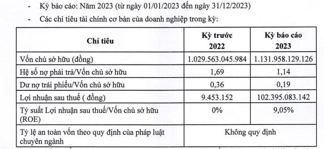 Năm 2023, Công ty ghi nhận lợi nhuận sau thuế đạt 102,4 tỷ đồng, cao hơn rất nhiều so với số lãi 9,5 triệu đồng trong năm 2022.