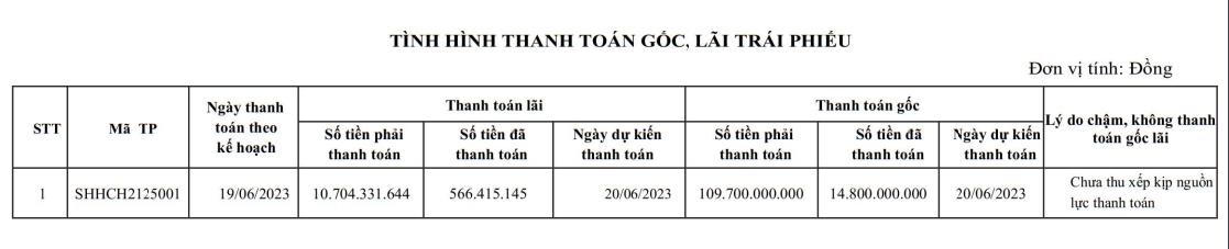 Theo kế hoạch, ngày 19/6/2023, Sông Hồng Hoàng Gia phải thanh toán 109,7 tỷ đồng tiền gốc và 10,7 tỷ đồng tiền lãi của lô trái phiếu SHHCH2125001. Tuy nhiên, đến ngày 20/6/2023, Công ty chỉ mới thanh toán được 14,8 tỷ đồng tiền gốc và hơn 566 triệu đồng tiền lãi trái phiếu.