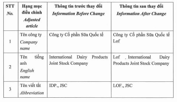 Công ty cổ phần Sữa Quốc tế IDP mới đây công bố đổi tên thành Công ty cổ phần Sữa Quốc tế LOF.