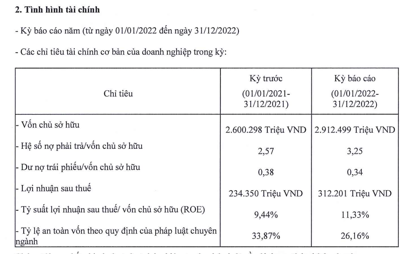 Đến cuối năm 2022, vốn chủ sở hữu của doanh nghiệp tài chính ghi nhận ở mức 2.912 tỷ đồng. Hệ số nợ phải trả/vốn chủ sở hữu là 3,25 lần. Dư nợ trái phiếu/ vốn chủ sở hữu là 0,34.