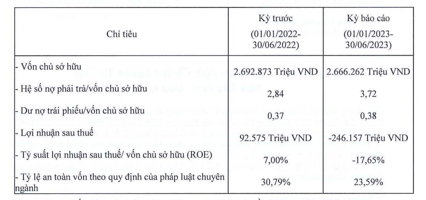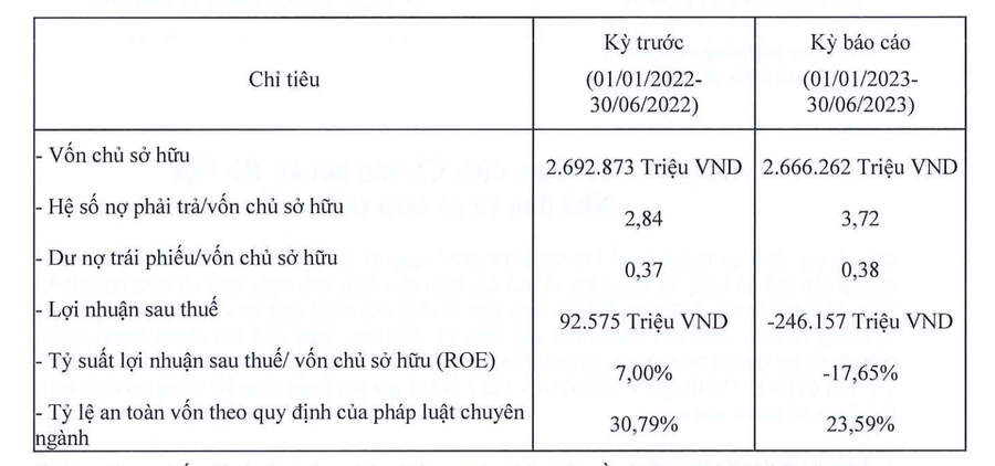 Cùng với đó, tỷ lệ an toàn vốn theo quy định của pháp luật chuyên ngành cũng giảm xuống ở mức 23,59%, con số này ở cùng kỳ năm 2022 là 30,79%.