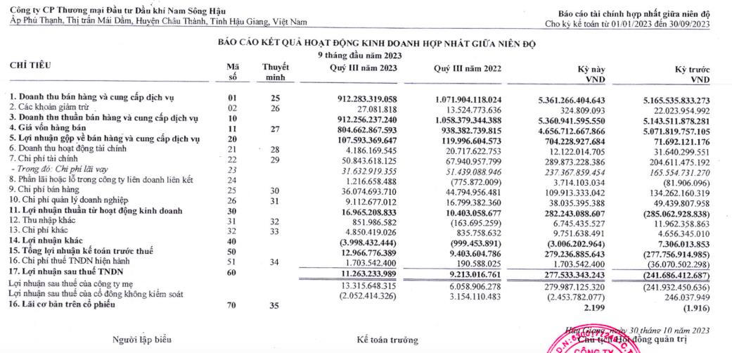 Kết thúc 9 tháng đầu năm 2023, Nam Sông Hậu hoàn thành 77,9% so với kế hoạch năm.
