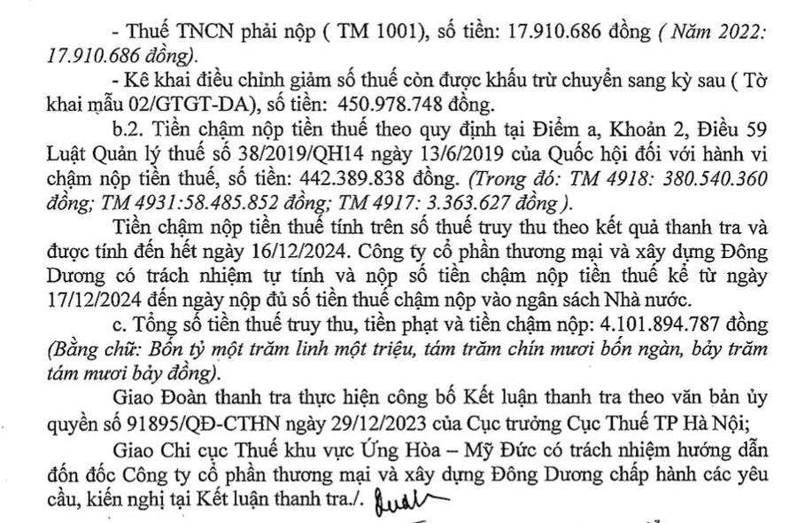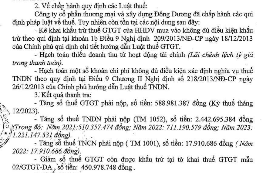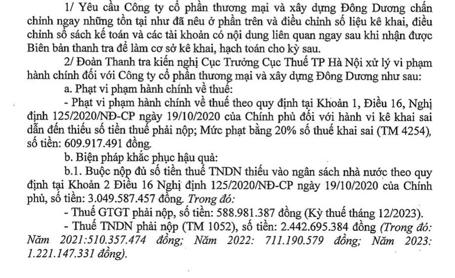 Bên cạnh đó, Đoàn thanh tra kiến nghị Cục thuế TP Hà Nội xử lý vi phạm hành chính đối với Công ty cổ phần Thương mại và xây dựng Đông Dương. Cụ thể phạt vi phạm hành chính về thuế đối với hành vi kê khai sai dẫn đến thiếu số tiền phải nộp, mức phạt bằng 20% số thuế khai sai với số tiền hơn 609,91 triệu đồng.