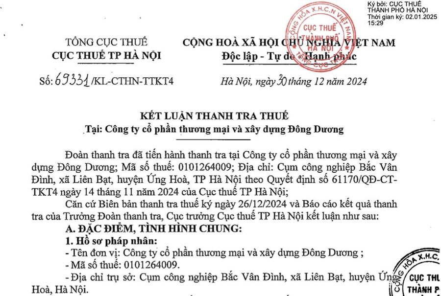 Cục thuế TP Hà Nội (Tổng cục thuế) ngày 30/12/2024 đã công bố kết luận thanh tra thuế tại Công ty cổ phần thương mại và xây dựng Đông Dương, có địa chỉ tại cụm công nghiệp Bắc Vân Đình, xã Liên Bạt, huyện Ứng Hòa, Hà Nội.