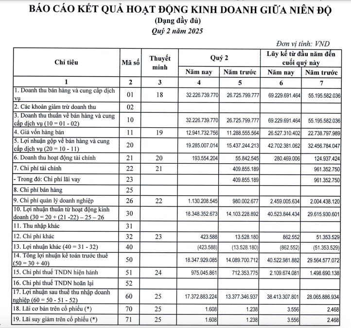 Với kết quả này, công ty thực hiện được 76% kế hoạch doanh thu và hơn 98% mục tiêu lợi nhuận năm 2025 chỉ sau nửa chặng đường.