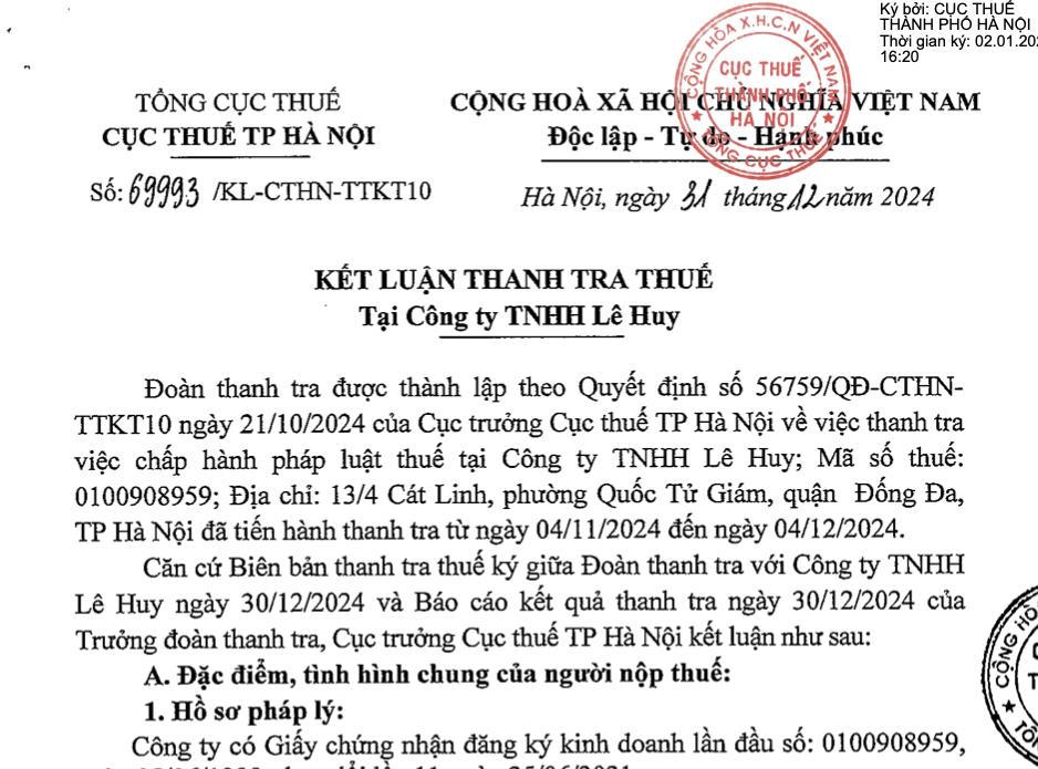Ngày cuối cùng của năm 2024, Cục thuế TP Hà Nội (Tổng Cục Thuế) công bố kết luận thanh tra thuế tại Công ty TNHH Lê Huy, có địa chỉ tại 13/4 Cát Linh, phường Quốc Tử Giám, quận Đống Đa, Hà Nội cho kỳ thanh tra từ 4/11/2024 - 4/12/2024.