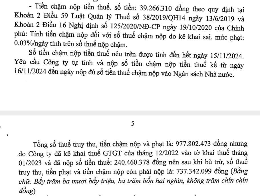 Như vậy, tổng số thuế truy thu, tiền chậm nộp và phạt là 977,8 triệu đồng nhưng do công ty đã kê khai thuế GTGT của tháng 12/2022 vào tờ khai thuế tháng 01/2023 và đã nộp số tiền thuế 240,46 triệu đồng nên sau khi bù trừ, số thuế truy thu, tiền phạt và tiền chậm nộp còn phải nộp là 737,3 triệu đồng.