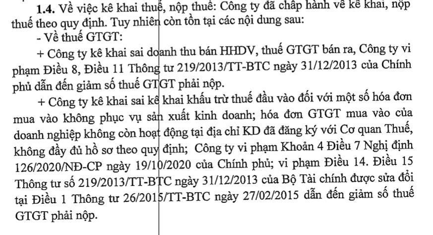 Tại kết luận thanh tra có chỉ rõ, công ty đã chấp hành về kê khai, nộp thuế theo quy định, tuy nhiên vẫn còn tồn tại một vài sai phạm.