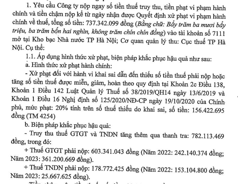 Cục thuế Hà Nội yêu cầu công ty nộp ngay số tiền thuế truy thu, tiền phạt vi phạm hành chính và tiền chậm nộp kể từ ngày nhận được quyết định vi phạm hành chính về thuế nêu trên.