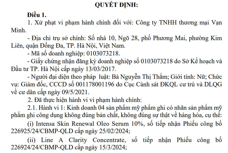 Ngoài phạt tiền, Công ty TNHH Thương mại Vạn Minh bị áp dụng hình thức xử phạt bổ sung là thu hồi 8 số tiếp nhận Phiếu công bố sản phẩm mỹ phẩm. Trước đó, ngày 22/7/2025, Cục Quản lý Dược đã ban hành quyết định thu hồi các số tiếp nhận này.
