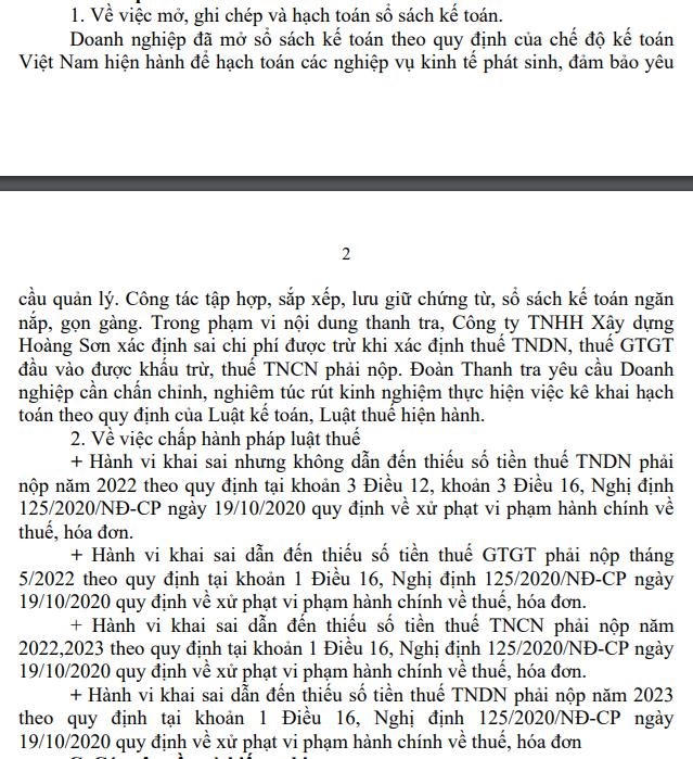 Theo kết luận thanh tra thuế số 8722/KL- CT của Cục thuế tỉnh Lào Cai về việc thanh tra tại Công ty TNHH Xây dựng Hoàng Sơn từ ngày 3/12/2024 đến 8/12/2024, đoàn thanh tra đã chỉ ra một số vi phạm còn tồn tại ở công ty.