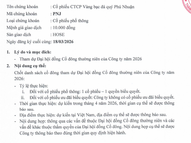 Ngày 18/3/2026 tới đây, PNJ sẽ chốt danh sách cổ đông tham dự họp ĐHĐCĐ thường niên năm 2026, cuộc họp dự kiến được tổ chức vào tháng 4/2026.