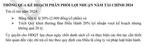 Năm 2024, VHC dự kiến trả cổ tức bằng tiền, tỷ lệ 20%, tương đương 2.000 đồng/cổ phần. Cùng với đó, VHC dự trích quỹ khen thưởng Ban điều hành 20% lợi nhuận vượt kế hoạch, nhưng không quá 20 tỷ đồng.