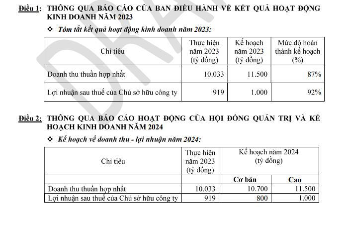 Về kế hoạch kinh doanh năm 2024, VHC dự kiến đặt mục tiêu doanh thu thuần hợp nhất cơ bản với 10.700 tỷ đồng, và lợi nhuận sau thuế cơ bản đạt 800 tỷ đồng.