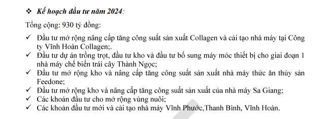 Cụ thể, doanh nghiệp đầu tư mở rộng nâng cấp tăng công suất sản xuất collagen và cải tạo nhà máy công ty Vĩnh Hoàn Collagen; đầu tư dự án trồng trọt, đầu tư kho và đầu tư bổ sung máy móc thiết bị cho giai đoạn 1 nhà máy chế biến trái cây Thành Ngọc.