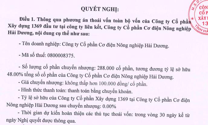 Hội đồng quản trị Công ty cổ phần Xây dựng 1369 (mã ck: C69) vừa ra quyết nghị thông qua phương án thoái toàn bộ 48% vốn tại công ty liên kết là Công ty cổ phần Cơ điện Nông nghiệp Hải Dương.