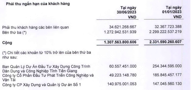 Khoản phải thu ngắn hạn của khách hàng giảm 44% xuống mức 1.307,5 tỷ đồng, trong đó, phải thu ở Công ty cổ phần Xây dựng và Quản lý dự án số 1 là 140,9 tỷ đồng, khoản phải thu tại Ban quản lý Dự án Đầu tư xây dựng công trình dân dụng và công nghiệp tỉnh Tiền Giang là 60,5 tỷ đồng, và phải thu Công ty cổ phần Đầu tư Phát triển Công nghiệp và Vận tải là 49,2 tỷ đồng.