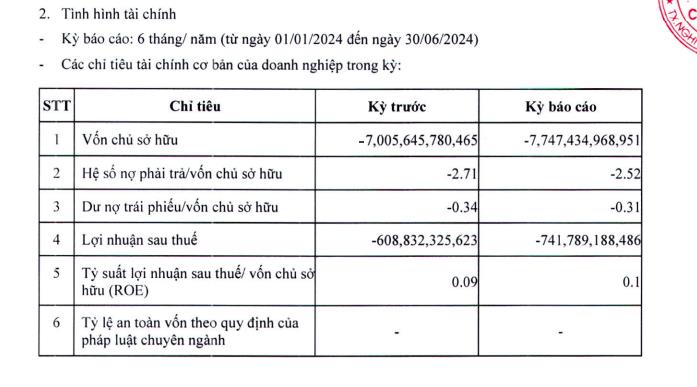 Vốn chủ sở hữu của Công ty ghi nhận khoản âm hơn 7.747,4 tỷ đồng. Tính đến thời điểm 30/6/2024, Công ty đang có hệ số nợ phải trả/vốn chủ sở hữu là -2,52 lần, tương đương tổng nợ phải trả 19.522 tỷ đồng.