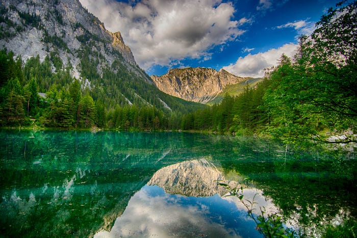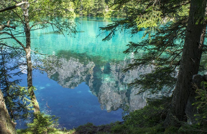 Trong các tháng mùa hè, nước từ sông băng tràn xuống thung lũng công viên Green Lake (Áo) tạo thành một hồ nước trong vắt, soi tận đáy.
