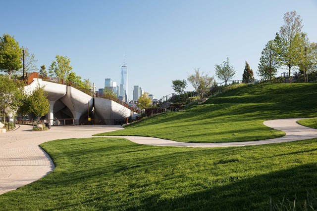 Từ điểm cao nhất của công viên có thể nhìn thấy trung tâm thương mại Thế giới và tượng Nữ thần Tự do.