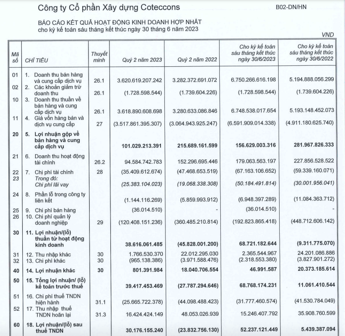 Lũy kế 6 tháng đầu năm, doanh thu thuần của Coteccons đạt 6.748,5 tỷ đồng, tăng 30% so với cùng kỳ năm trước. Lợi nhuận sau thuế Conteccons gấp 9,6 lần so với cùng kỳ năm 2022, đạt 52,2 tỷ đồng.