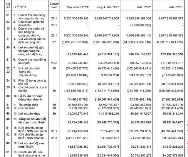 Doanh nghiệp xây dựng này lỗ thuần từ hoạt động kinh doanh cả năm gần 54 tỷ đồng. Tuy nhiên, nhờ khoản lợi nhuận khác (88 tỷ đồng), Coteccons vẫn lãi ròng gần 21 tỷ đồng, giảm gần 14% so với năm 2021 và là mức thấp nhất kể từ khi hoạt động.