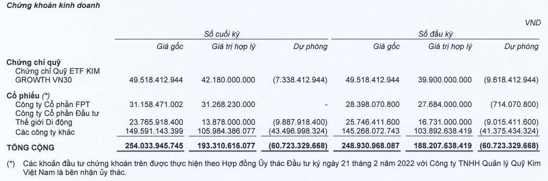 Đồng thời, Coteccons còn dành hơn 254 tỷ đồng đầu tư cổ phiếu và chứng chỉ quỹ. Trong đó, một số khoản đầu tư lớn trong danh mục bao gồm CCQ KIM GROWTH VN30 ETF (49,5 tỷ), FPT (hơn 31 tỷ), MWG (gần 24 tỷ), còn lại không được thuyết minh chi tiết. Coteccons phải trích lập dự phòng gần 61 tỷ, tương đương tạm lỗ 24% tại ngày 31/3/2022 cho khoản đầu tư trên.