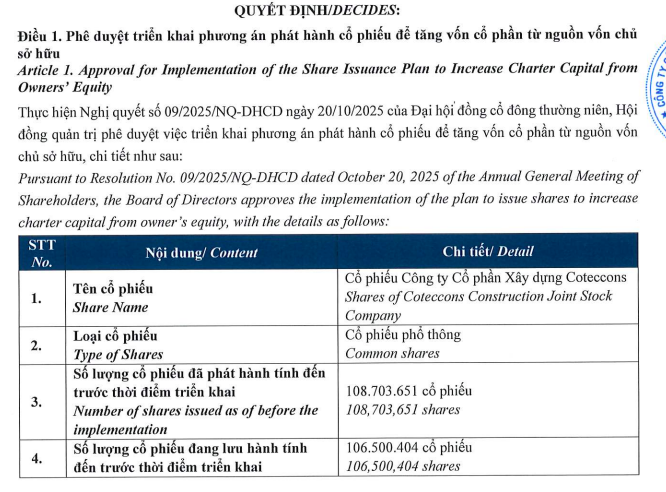 Nguồn vốn phát hành từ quỹ đầu tư phát triển tại Báo cáo tài chính riêng năm 2025 được kiểm toán. Nếu phát hành thành công, vốn điều lệ của Coteccons dự kiến sẽ nâng lên 1.140,29 tỷ đồng.