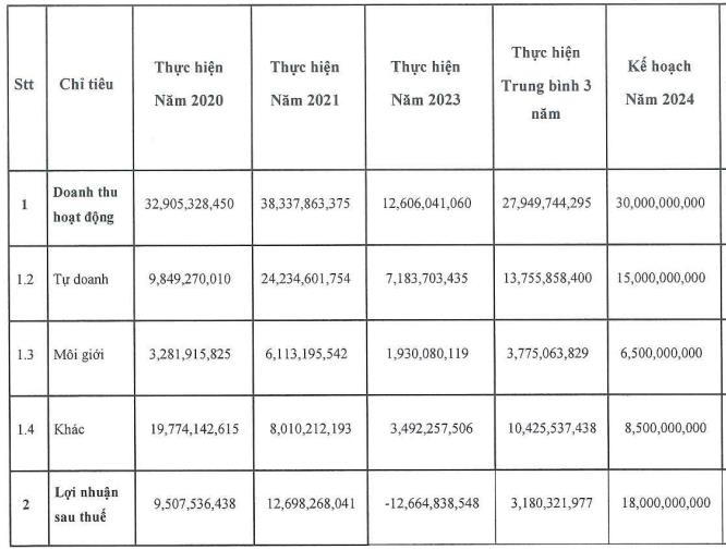 Theo đó, CSI trình ĐHĐCĐ mục tiêu doanh thu hoạt động năm 2024 ở mức 30 tỷ đồng, gấp 2,4 thực hiện năm trước. Trong đó, nguồn thu chủ lực từ tự doanh dự kiến 15 tỷ đồng, gấp đôi thực hiện năm trước; còn môi giới là 6,5 tỷ đồng, gấp 3,4 lần. Lãi sau thuế mục tiêu ở mức 18 tỷ đồng, năm trước lỗ 12,7 tỷ đồng.