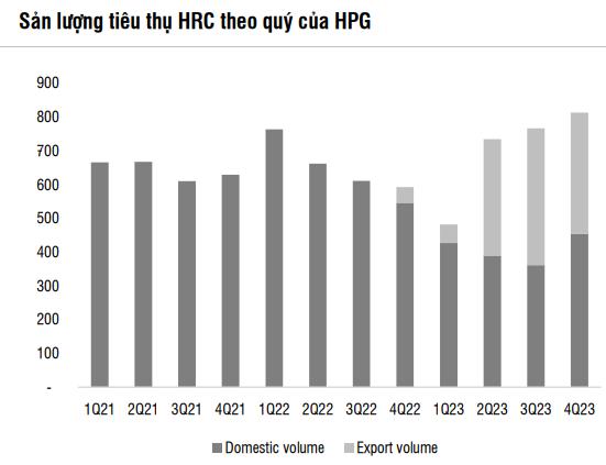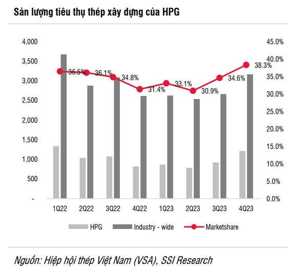 Trong đó, mặc dù thị phần thép xây dựng của HPG trong cả năm 2023 đi ngang ở mức 34,7%, nhưng tính riêng thị phần quý 4/2023 đã tăng lên mức cao kỷ lục là 38,3%. Ngoài ra, nếu không tính đến kênh xuất khẩu, thị phần của HPG tại thị trường nội địa tăng từ 30,8% trong năm 2022 lên 32,5% trong năm 2023 do sản lượng của các doanh nghiệp sản xuất khác giảm.