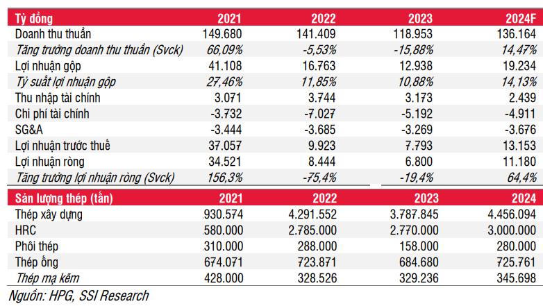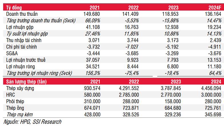 SSI Research duy trì dự báo lợi nhuận ròng HPG năm 2024 ở mức 11,2 nghìn tỷ đồng, tương ứng tăng 64,5% so với năm 2023, nhờ sự phục hồi cả về sản lượng tiêu thụ và giá thép. SSI giả định rằng sản lượng thép xây dựng và HRC của Hòa Phát trong năm 2024 sẽ lần lượt đạt 4,5 triệu tấn (tăng 18%) và 3 triệu tấn (tăng 8%). Ngoài ra, giá thép xây dựng và HRC bình quân được giả định sẽ tăng 3% so với mức tăng bình quân là 5% đối với quặng sắt và giá than. Do đó, kỳ vọng biên lợi nhuận gộp của HPG sẽ cải thiện lên 14,1%.