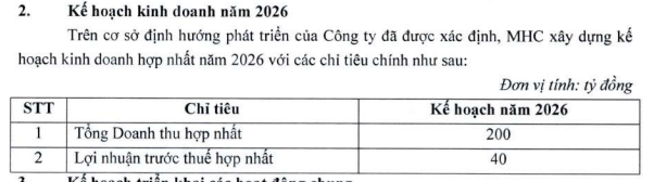 Trước đó, kết thúc năm 2025, MHC ghi nhận doanh thu 400,5 tỷ đồng, gấp đôi kế hoạch đề ra. Lợi nhuận trước thuế đạt 196,87 tỷ đồng, vượt xa mục tiêu 30 tỷ đồng, tương ứng mức hoàn thành hơn 650%. Trong đó, hoạt động đầu tư đóng góp tới 88,95% tổng doanh thu.