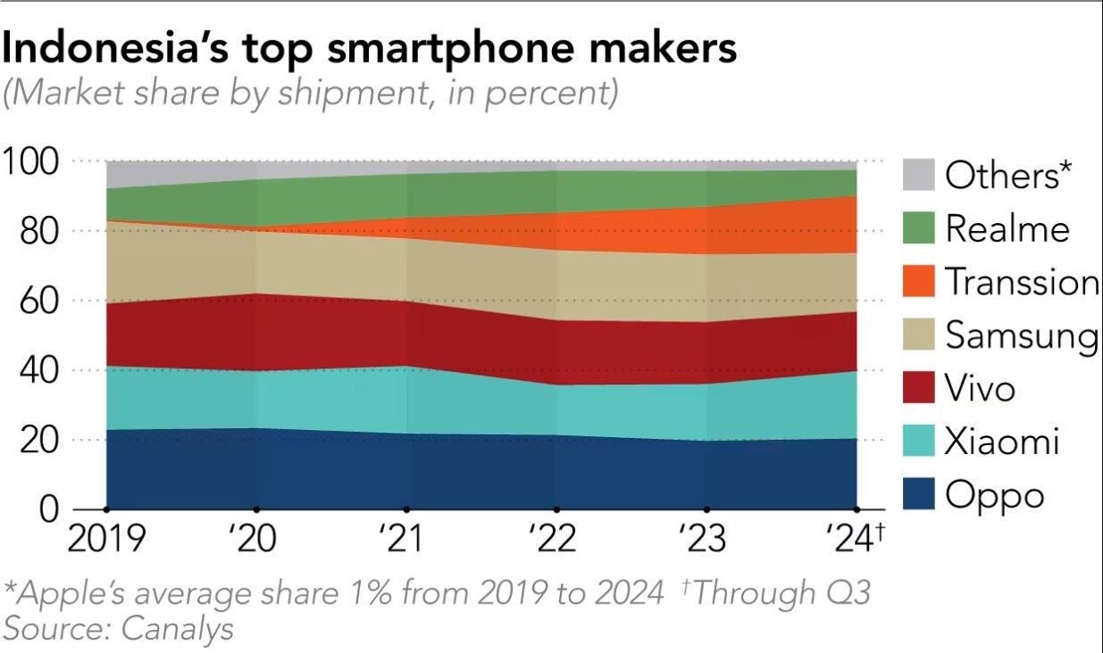 Theo dữ liệu từ Canalys, hãng Oppo đã dẫn đầu thị phần tại Indonesia với hơn 20% trong 3 quý đầu năm 2024, tiếp đến là Xiaomi, Vivo, Samsung và Transsion. Tập đoàn Apple chiếm khoảng 1% thị phần tại Indonesia.