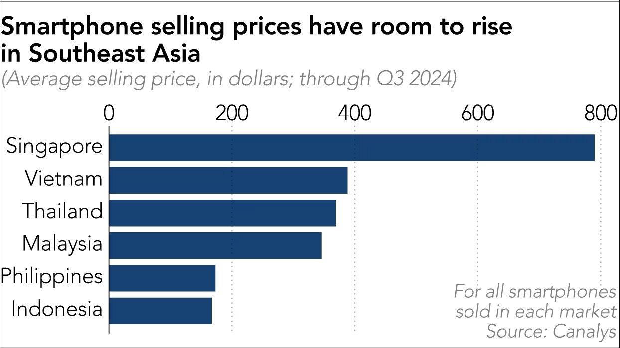Ví dụ, số liệu của Canalys cho thấy giá bán điện thoại thông minh trung bình ở Indonesia chỉ khoảng 167 USD. Các nước láng giềng như Malaysia, Thái Lan và Việt Nam có giá trên 300 USD còn các thị trường trưởng thành hơn ở châu Á như Singapore và Nhật Bản có giá trung bình lần lượt là 790 USD và 703 USD.