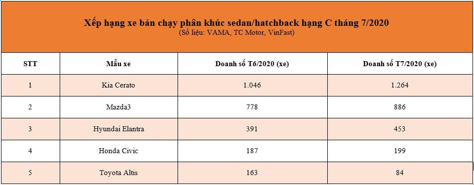 Hết tháng 7/2020, Kia Cerato báo cáo bán được 1.264 xe, cộng dồn 7 tháng đầu năm là 4.815 xe. Đây đã là tháng thứ 2 liên tiếp và là tháng thứ 4 trong năm, Kia Cerato có doanh số vượt qua Mazda3 để đứng đầu phân khúc xe hạng C.
