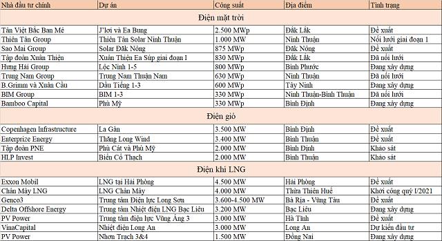 Một số đơn vị khác cũng đề xuất những dự án lớn như VinaCapital dự kiến đầu tư Nhà máy Nhiệt điện Long An vốn 3,1 tỷ USD, Tập đoàn Exxon Mobil đề xuất dự án khí LNG tại Hải Phòng với tổng mức đầu tư gần 5,1 tỷ USD, Genco3 dẫn đầu liên doanh đầu tư Trung tâm Điện lực Long Sơn (Vũng Tàu) có tổng mức đầu tư gần 3,8 tỷ USD. Hay các dự án Nhà máy điện khí LNG Chân Mây (Huế) vốn 6 tỷ USD, Trung tâm điện lực LNG Cà Ná (Ninh Thuận) giai đoạn 1 có vốn đầu tư 49.000 tỷ đồng cho công suất 1.500 MW.…