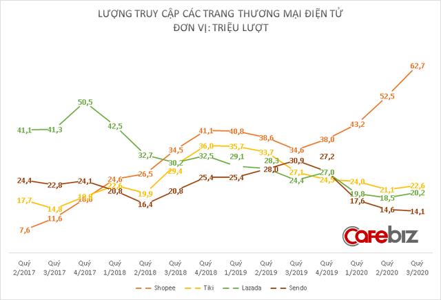 Cuộc đua tứ mã: Shopee cho 3 đối thủ "hít khói", lượng truy cập cao gấp 3 lần Tiki và Lazada; Sendo hụt hơi 4 quý liên tiếp