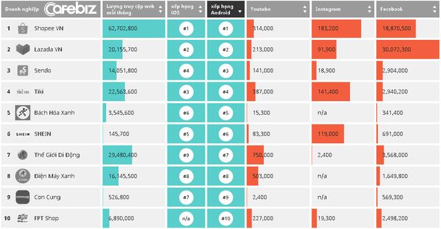 Đứng thứ 2 và thứ 3 là Tiki và Lazada, khi 2 sàn thương mại điện tử này cùng có lượng truy cập trở lại. Đối với Tiki, lượng truy cập tăng lên 22,6 triệu lượt sau khi liên tục sụt giảm 6 quý liên tiếp trước đó. Lazada đạt 20,2 triệu lượt truy cập, tăng 9% so với tháng trước.