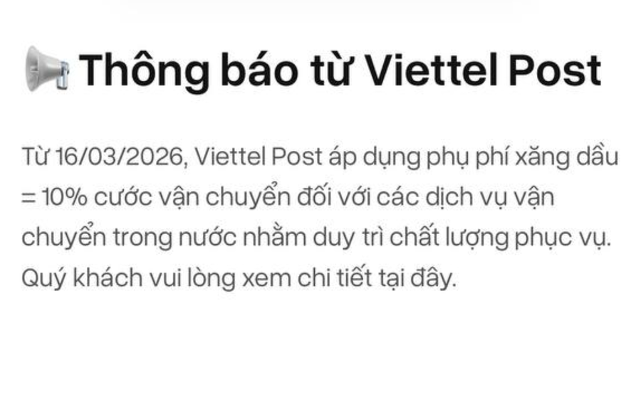 Sáng ngày 11/03/2026, Công ty Cổ phần Bưu chính Viettel (Viettel Post) phát đi thông báo cập nhật biểu phí dịch vụ. Bắt đầu từ ngày 16/03/2026, doanh nghiệp sẽ tính thêm khoản phụ phí xăng dầu ở mức 10% trên cước vận chuyển đối với toàn bộ các dịch vụ chuyển phát trong nước. Quyết định điều chỉnh này được đưa ra để bù đắp phần chi phí đầu vào đang gia tăng, qua đó giữ vững chất lượng phục vụ khách hàng trên toàn mạng lưới.