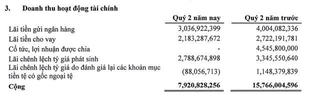 Doanh thu hoạt động tài chính giảm 49,3% lùi về mức 7,9 tỷ đồng trong quý II/2023. Nguyên nhân là do trong quý này, công ty không ghi nhận khoản cổ tức, lợi nhuận được chia trị giá 4,5 tỷ đồng như quý II năm ngoái.
